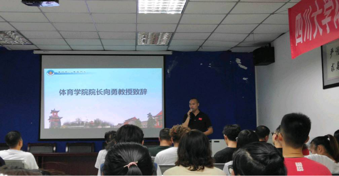 首先体育学院院长向勇教授致辞。第一,新学期新征程,对新来研究生表示欢迎和祝贺。第二,向院长对同学们也提出三点希望,一是珍惜研究生生活,利用多学科交叉融合环境,实现自身综合素质提升。二是希望三年学有所成,三是坚定目标,朝着方向不懈前进。第三,提出一点要求,做出表率,体现川大面貌,形象,川大体育人的精神。最后作为学长关心同学们学习生活,希望同学们顺利开启在川大学术之路。