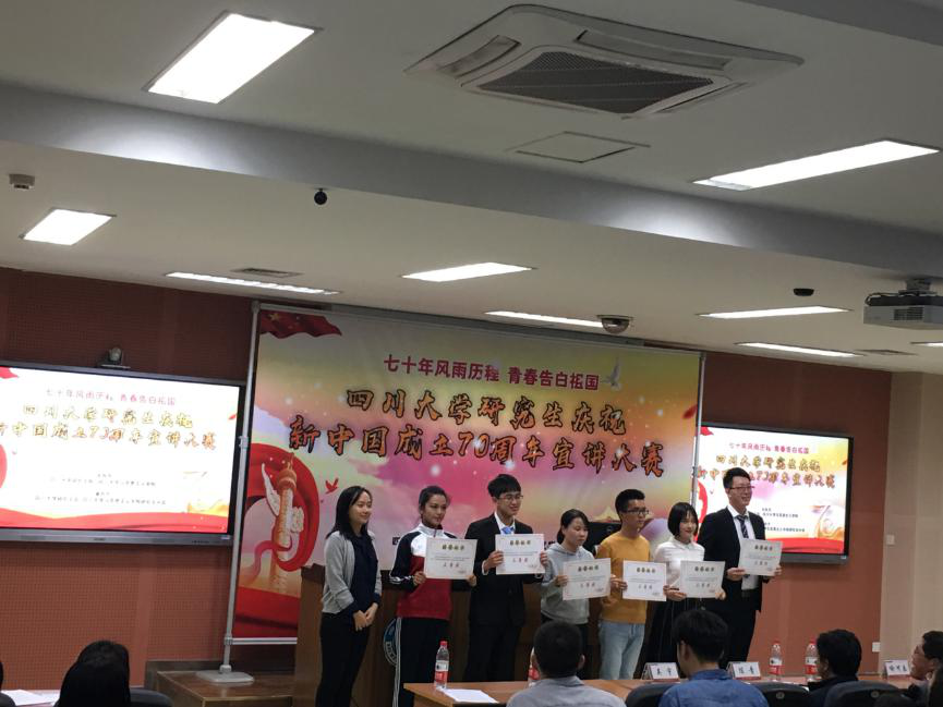 10月18日晚,研究生工作部、马克思主义学院举办的“七十年风雨历程,青春告白祖国” PPT制作与宣讲大赛在研究生院3区231举行。体育学院作为28支之一的代表队经过层层筛选进入决赛,体育学院代表队在比赛中展现风采,亮出特色,最终以第八名的好成绩获得宣讲比赛的三等奖。