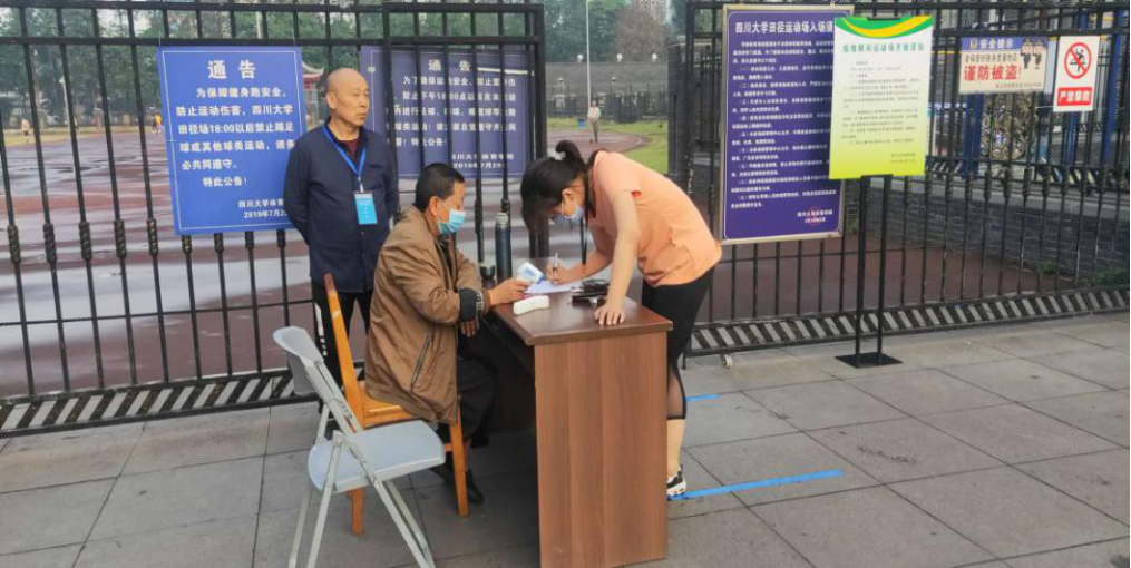 华西校区运动场锻炼者在进行入场登记