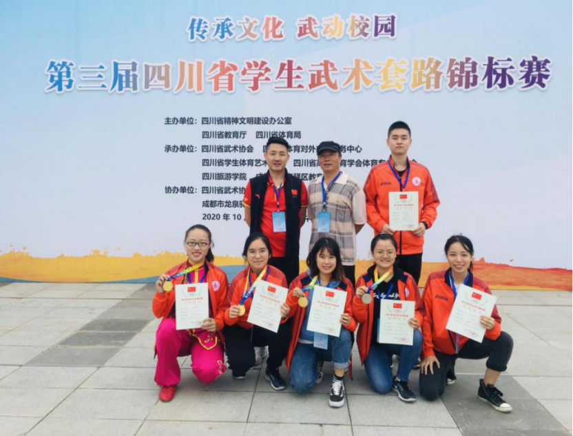 10月2日至4日,第三届四川省学生武术套路锦标赛在四川省龙泉驿区龙泉中学体育馆举行。本次赛事由四川省精神文明建设办公室、四川省教育厅、四川省体育局共同主办,参赛队员来自全省各地大、中、小学近二十所高校,共计500余名运动员,竞争激烈。经过前期选拔和刻苦训练,我校武术代表队共派出6名队员参加了7项比赛,取得了四个冠军,一个亚军,两个第四名以及团体三等奖的优异成绩,教练员谢云龙老师获“优秀教练员”称号。
