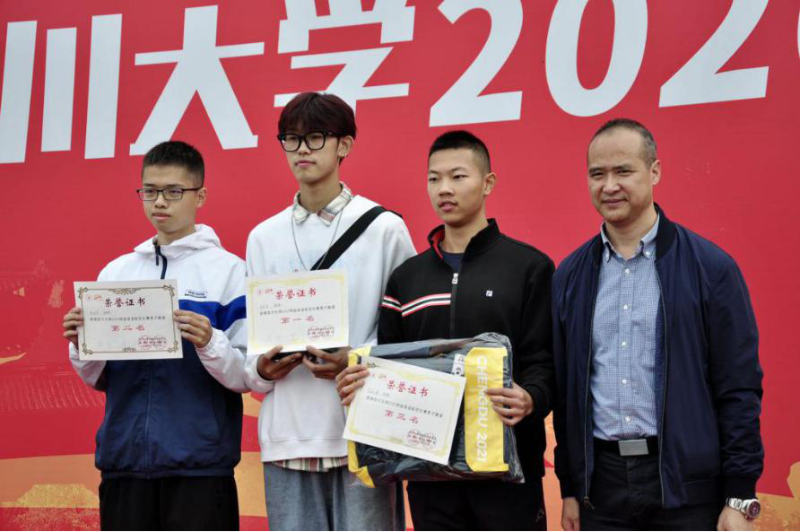 体育学院党总支书记夏泽友、院长向勇、副院长韩海军、邱硕立,高分子学院党委副书记钱祉祺,国内著名国家级田径裁判专家宋建洪、本次田径运动会裁判长谢维军分别为获得各个单项和团体项目的学生及学院颁发了奖状、奖牌和奖品。本次奖品极具收藏价值和特殊意义,由四川省工商银行芷泉支行赞助,均是为明年成都世界大学生运动会定制的各类纪念品。