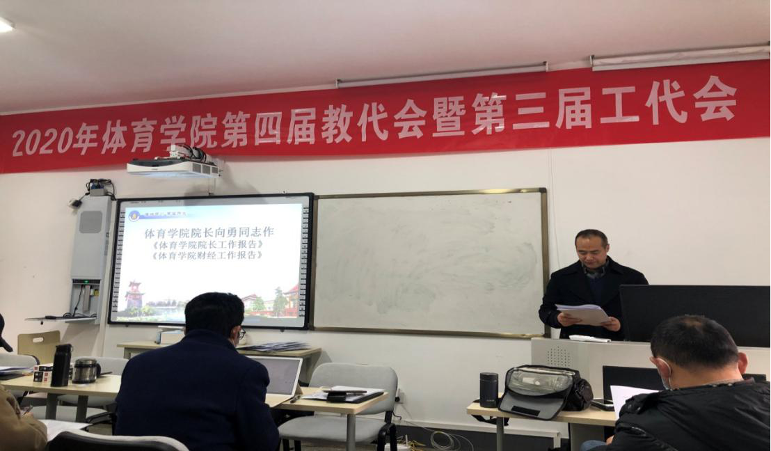 按照学习贯彻十九届五中全会精神的要求,在制定谋划学院十四五发展规划的关键时候,我院第四届教代会暨第三届工代会第四次会议经过精心筹备,12月25日开幕了!大会的指导思想和主要任务是:学院“双代会”要在党总支的领导下,保持和增强政治性、先进性和群众性,团结带领广大教职工,围绕学院十四五及未来十五年科学发展这一主题,积极探讨、集思广益、献计献策。本次大会听取和审议了《体育学院工作报告》、《体育学院财经工作报告》、《体育学院工会工作报告》,并对三个《报告》以及《体育学院绩效分配考核办法》中关于科研工作量认定的部分修订内容进行了表决。