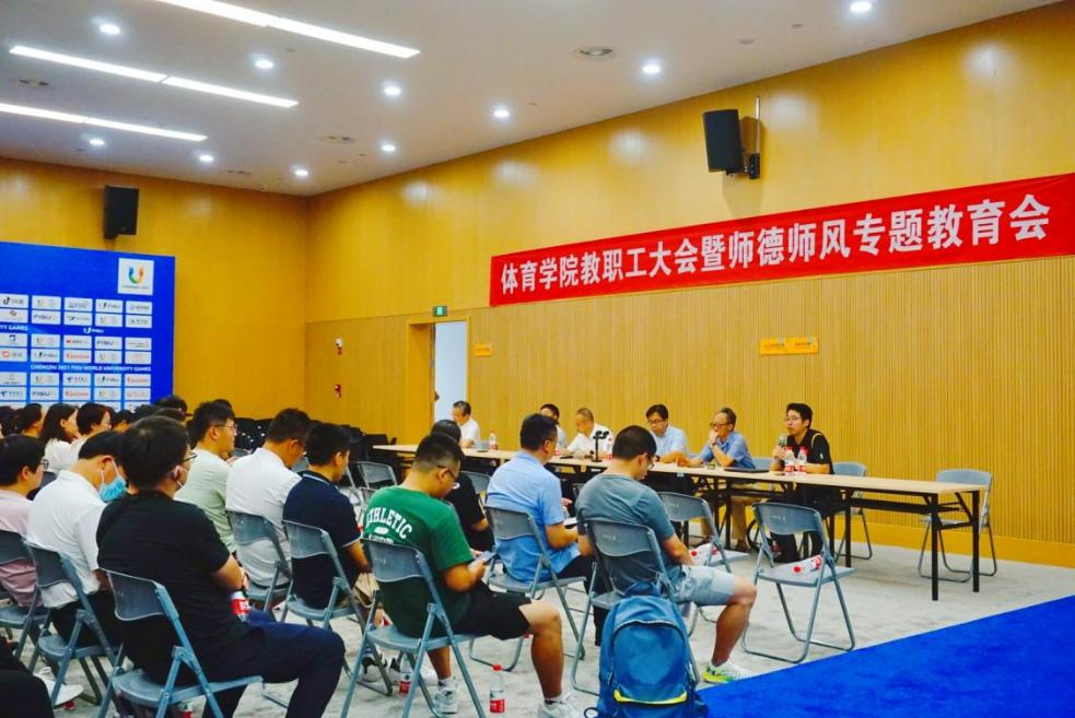 7月9日上午10点,体育学院在体育馆新闻发布厅召开全体教职工大会暨师德师风专题教育会,会议由韩海军副院长主持,全体教职员工参加。