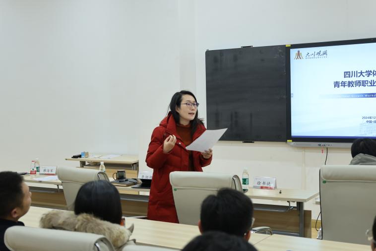 人事处青年教师工作科副科长徐书婕,重点介绍了“大川观澜”工作坊活动设立的背景和学校针对青年教师的项目支持计划情况,并希望老师们积极申报,人事处将积极助力体育学院青年教师的成长和发展。