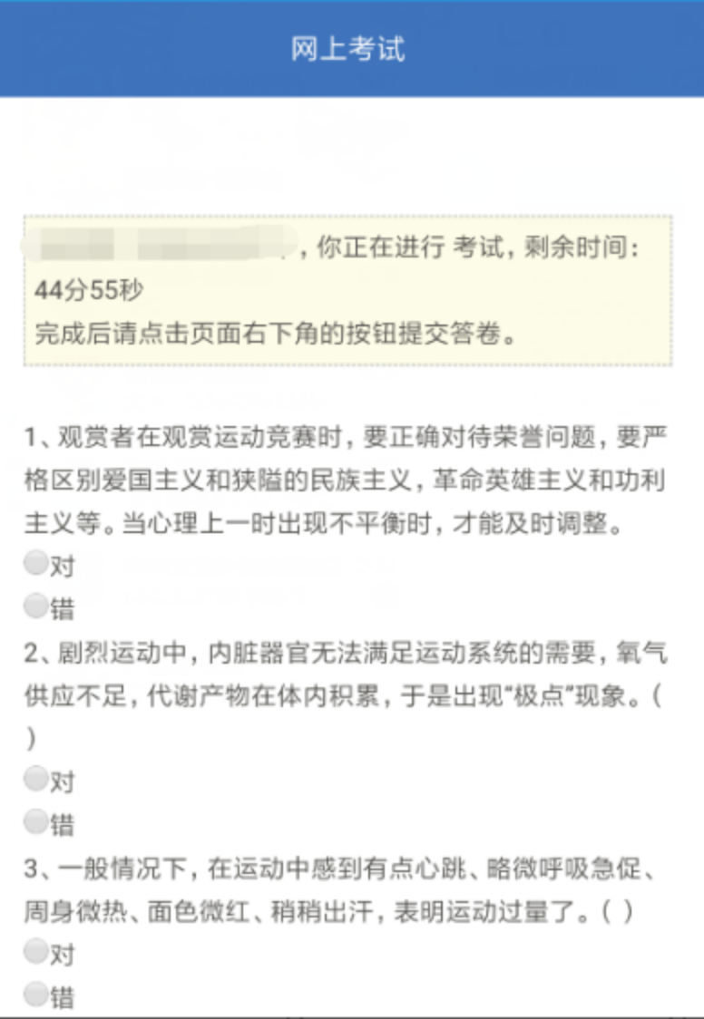 2.所有考试结束并关闭的时间为2023年6月9日17:00,错过考试一律不补。如考试操作有问题,请第一时间联系体育学院教学科解决。