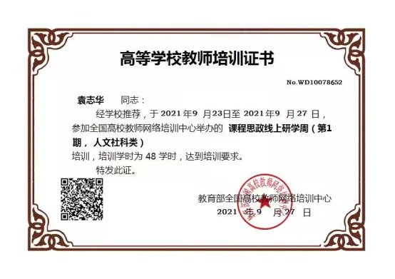 经过教师自愿报名和学院推荐,体育学院教师袁志华、李姗姗、蒋海燕、缪美灵、黄雨、李伟等6位教师参加了全国高校教师网络培训中心联合新华思政与相关国家级课程思政教学研究示范中心联合举办的“课程思政高质量推进”线上研学周(第1期)。经过为期4天的学习,6位教师均已获得培训证书。