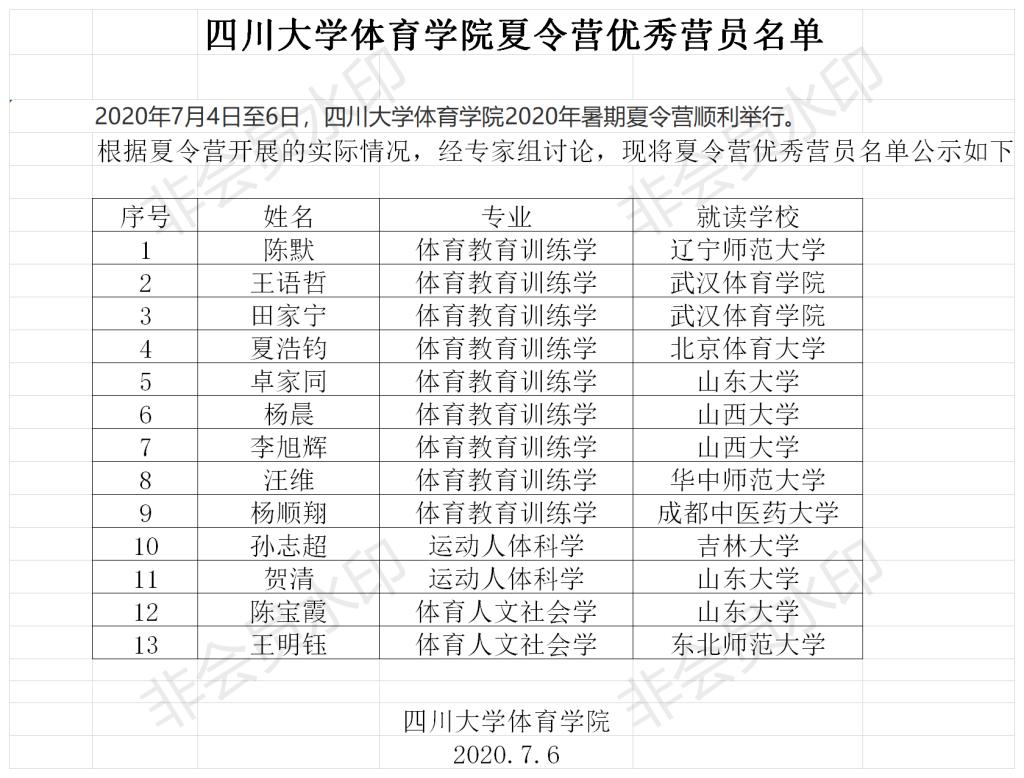 2020年永利集团3044am体育学院夏令营优秀营员名单