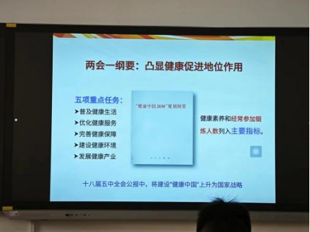 随后,韩海军同志结合自己的工作经历和思考,深入浅出地阐述了体卫融合的内涵和外延。他指出,体卫融合不仅仅是体育和卫生的简单相加,而是要将体育运动和公共卫生两个领域的资源、技术和理念进行深度融合,形成一种全新的健康服务模式。他强调了体卫融合在预防疾病、促进健康、提高生活质量等方面的重要作用,并呼吁体育学院学生党员们要积极投身于体卫融合事业中,为推动全民健康事业的发展贡献自己的力量。在阐述体卫融合的重要性和实践路径时,韩海军同志进一步将这一议题与中国梦相联系。他强调,中国梦是全体中国人民的共同梦想,其中包括了人民对美好生活的向往和对健康的追求。体卫融合的体系构建正是实现这一梦想的具体行动之一。通过整合体育和卫生资源,创新健康服务模式,我们不仅能够提升国民的健康水平和生活质量,还能够为社会的和谐稳定和持续发展奠定坚实基础。