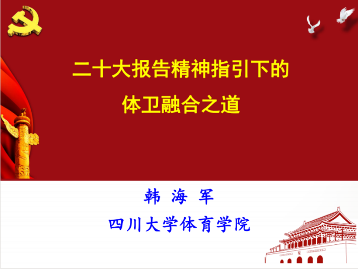 韩海军同志首先对党的二十大报告进行了深入解读,强调了体育在全面建设社会主义现代化国家新征程中的重要地位和作用。他指出,党的二十大报告提出了“广泛开展全民健身活动,促进群众体育和竞技体育全面发展”的目标,这为我们体育事业的发展指明了方向。同时,他强调了体卫融合在促进全民健康事业中的重要作用,指出体卫融合是实现健康中国战略的重要途径。