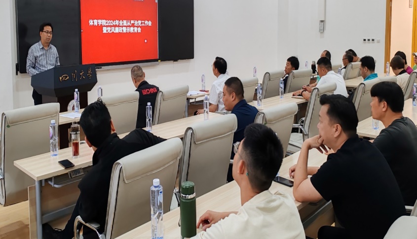 4月16日,体育学院在望江体育中心会议室召开2024年全面从严治党工作会暨党风廉政警示教育会议,学院班子成员、组织员、总支委员、党支部书记,全体中层干部、全体教练员参会。会议由院长向勇主持。