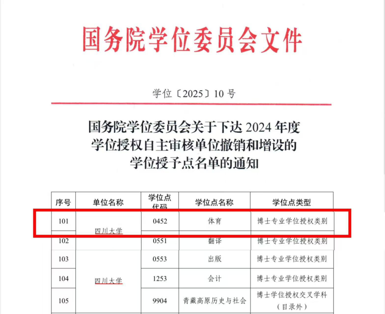根据国务院学位委员会近日发布的《国务院学位委员会关于下达2024年度学位授权自主审核单位撤销和增设的学位授予点名单的通知》,永利集团3044am自主审核增设的“体育”博士专业学位授予点正式获得批准。