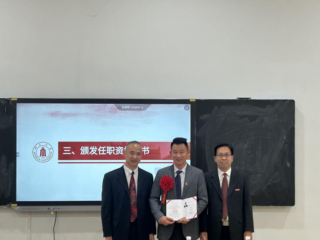 仪式伊始,向勇院长发表开场致辞。他强调,此次聘任仪式不仅是对教师个人专业成长的肯定,更是对学院人才队伍不断壮大、教学科研水平持续提升的有力见证。随后,向勇院长宣读了聘任文件,宣布董强老师获得副高级职称聘任,并和方云书记为其颁发聘用证书。